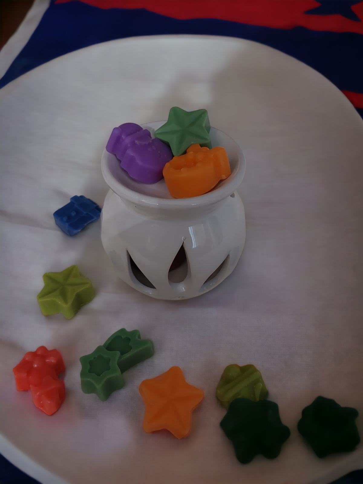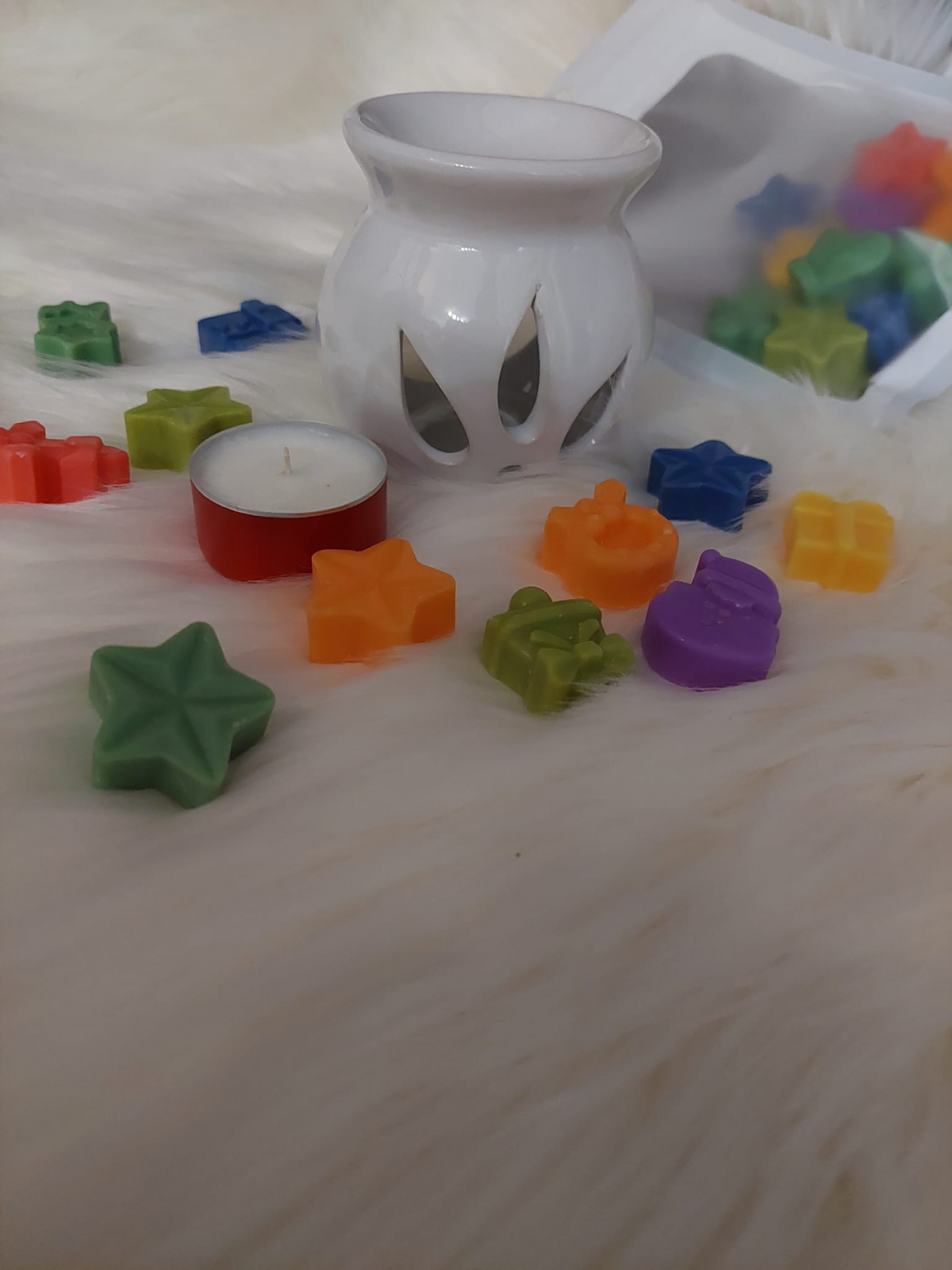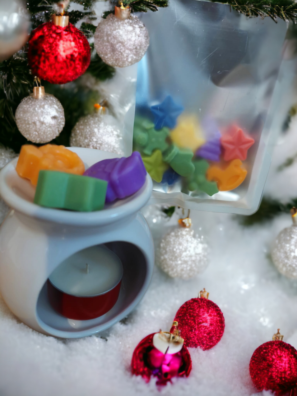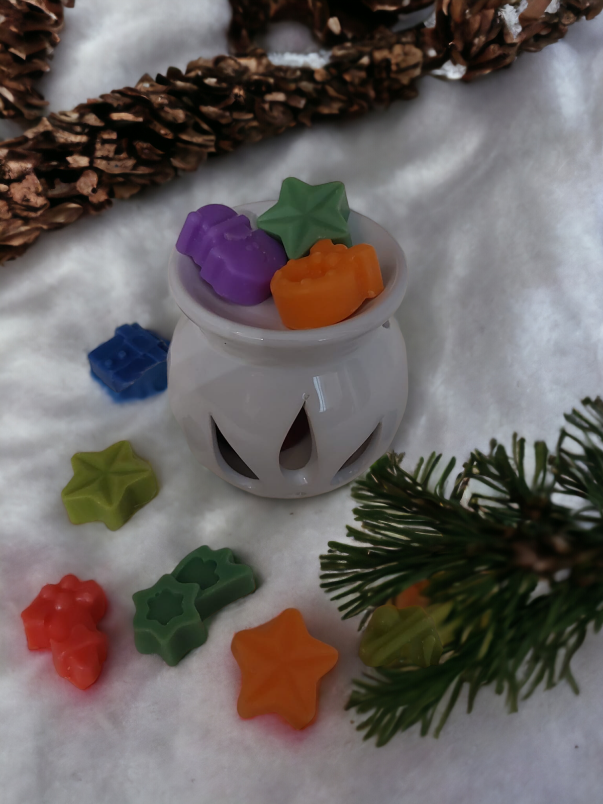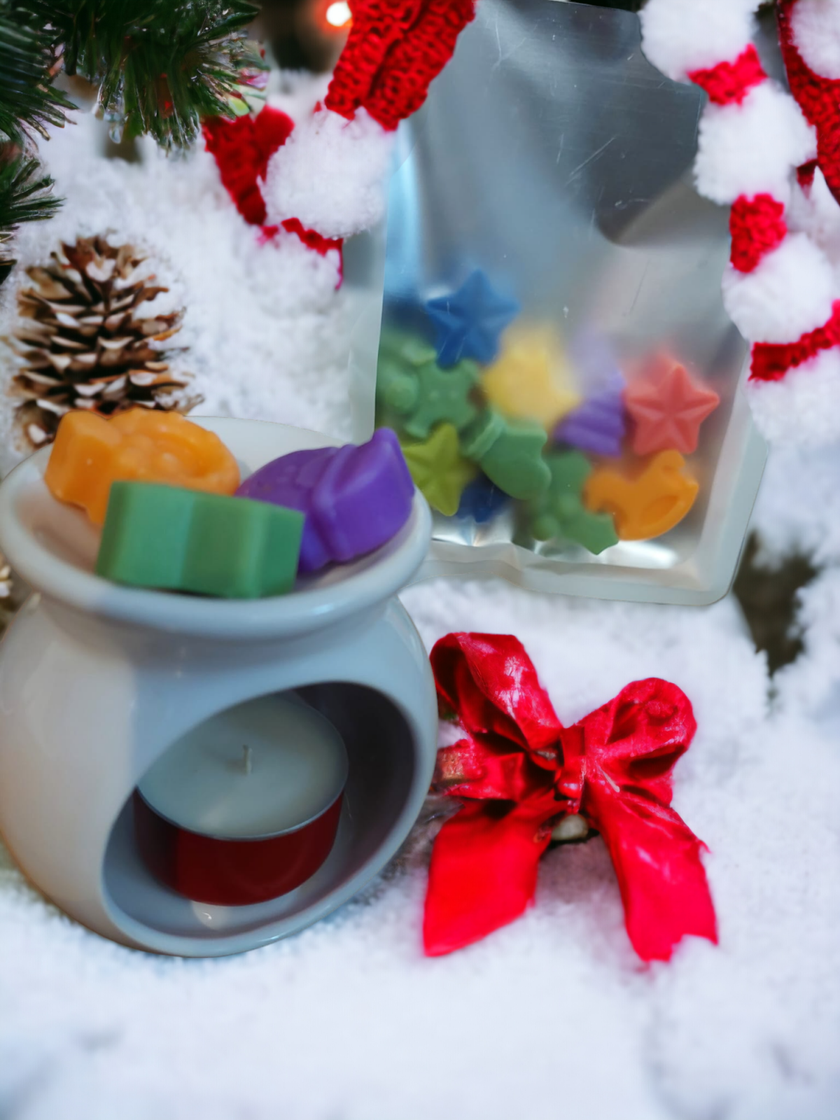 - 50 g ceară parfumată sub formă de figurine decorative cu tematică de Crăciun în diverse forme vesele și colorate, tip "wax melts" din ceară naturală de soia și ulei parfumat special creat pentru lumânări.