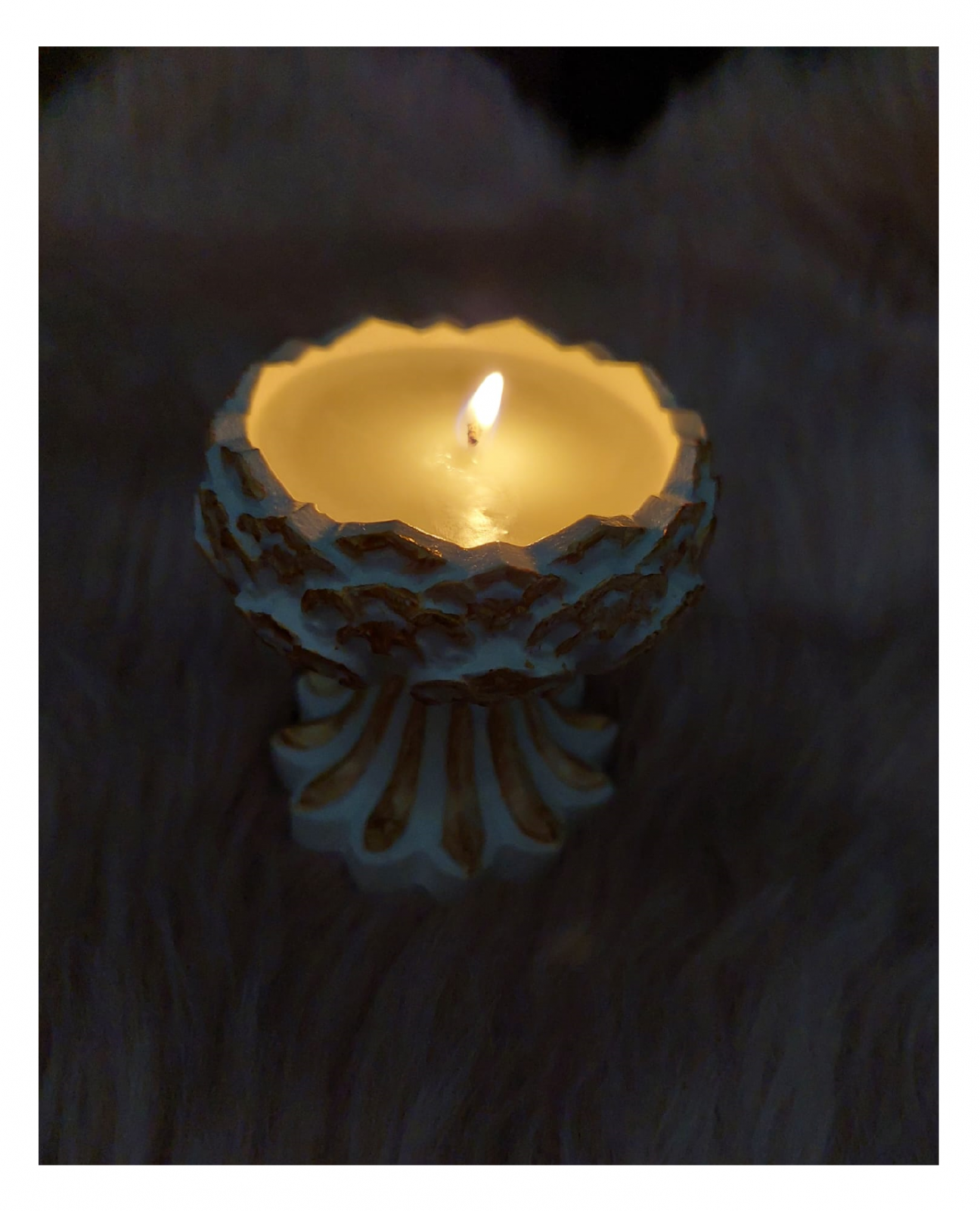 Recipientele folosite pentru această lumânare sunt turnate din praf ceramic și pregătite manual. Vasul este pictat manual cu culori acrilice aurii. Pentru recipiente colorate, culoarea lor poate varia uneori, pozele prezentate sunt cu caracter orientativ.