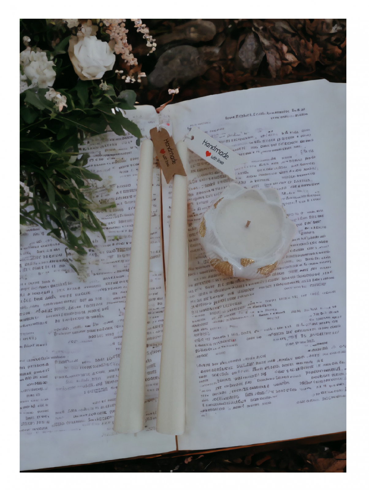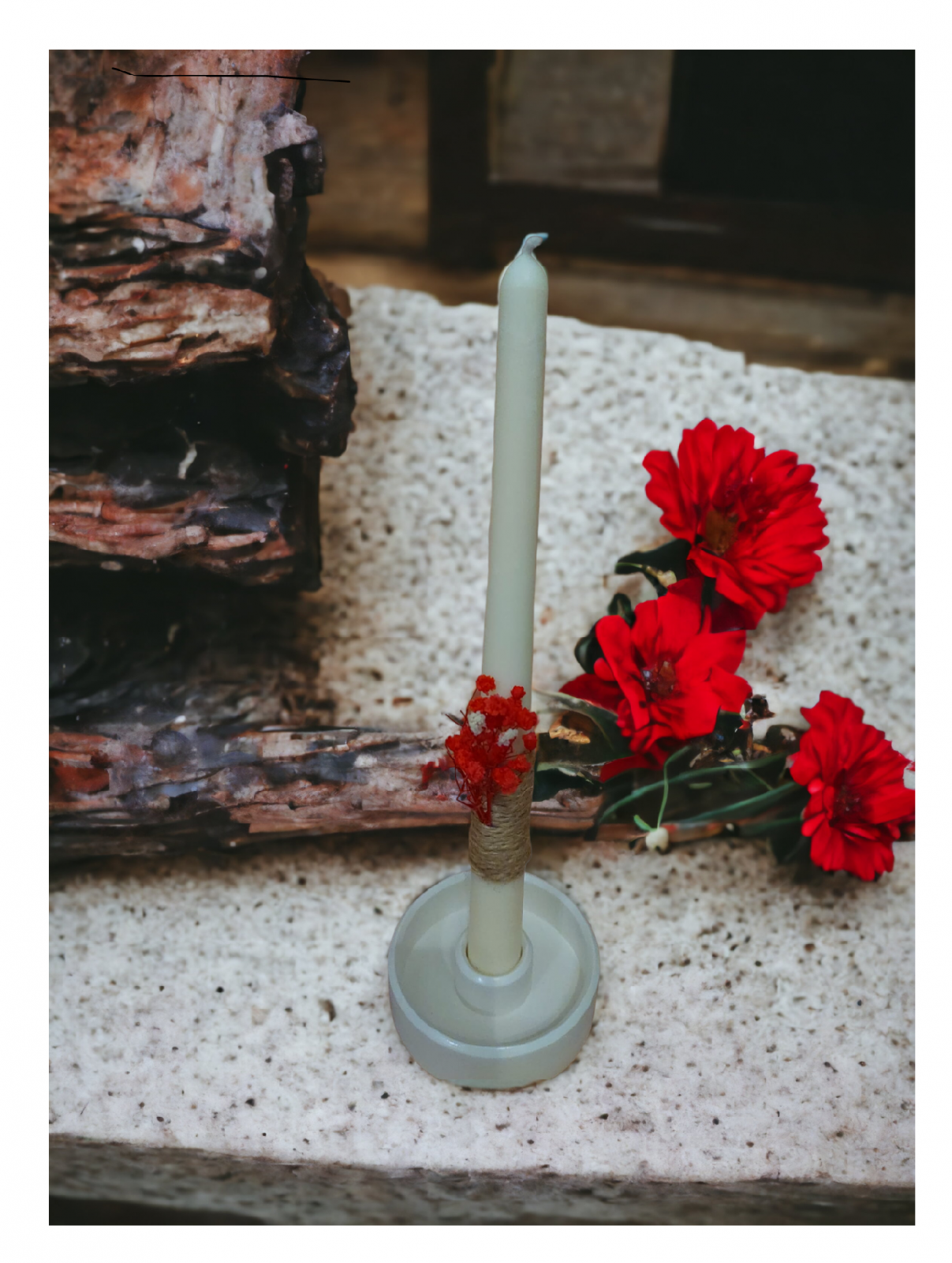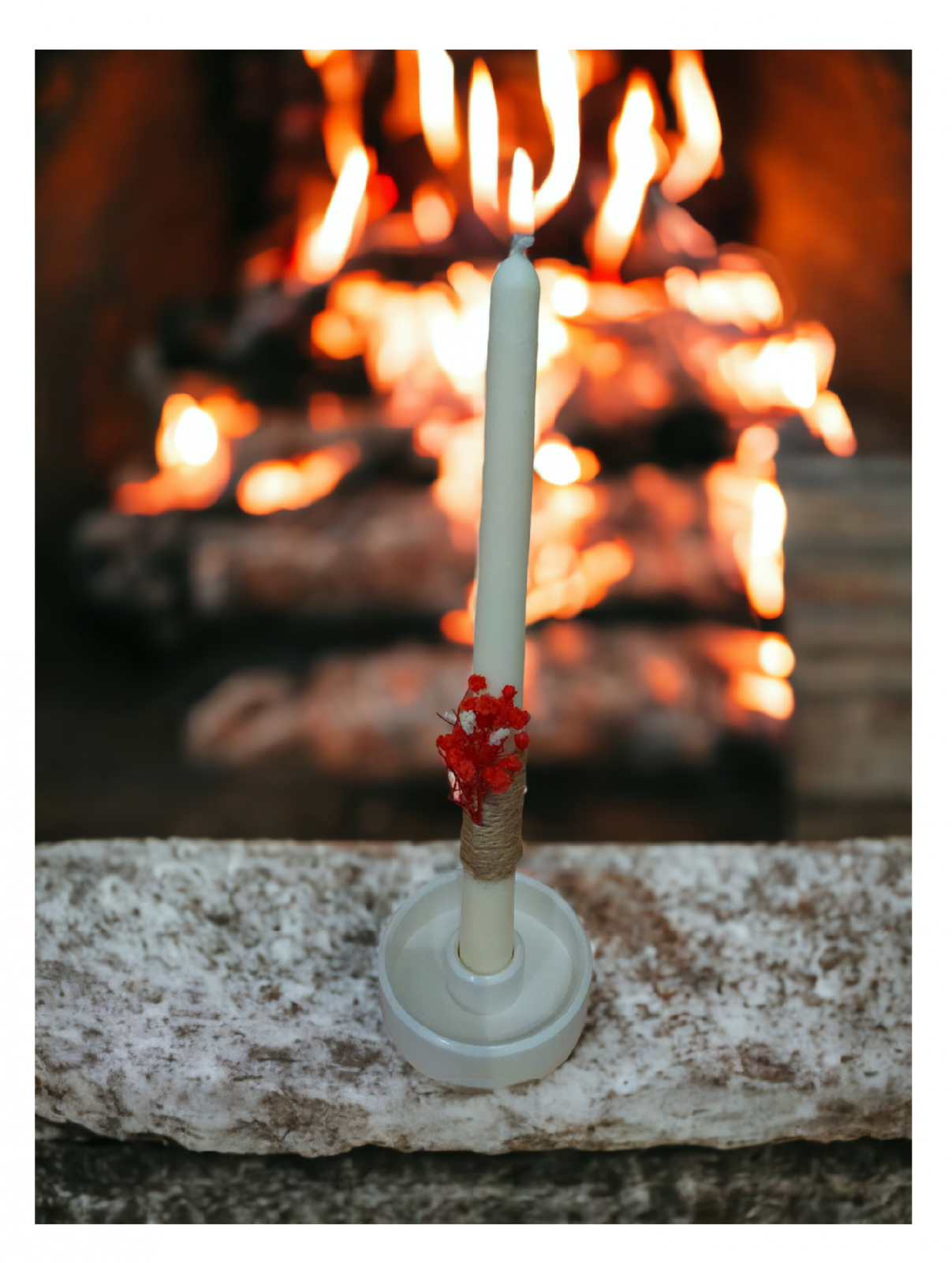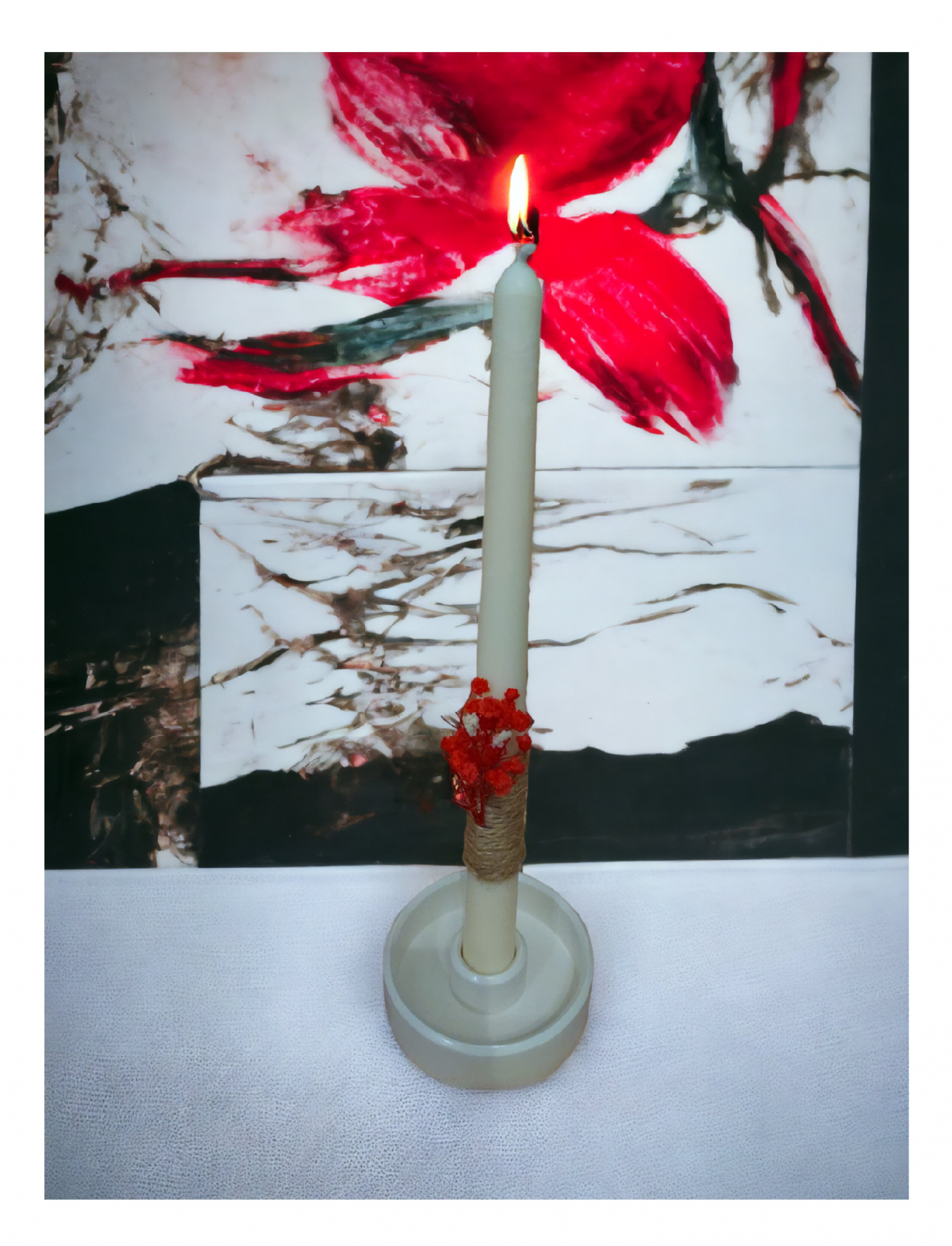 Lumânarea este decorată cu flori naturale uscate și cu fir natural de iută, se livrează ambalată individual.