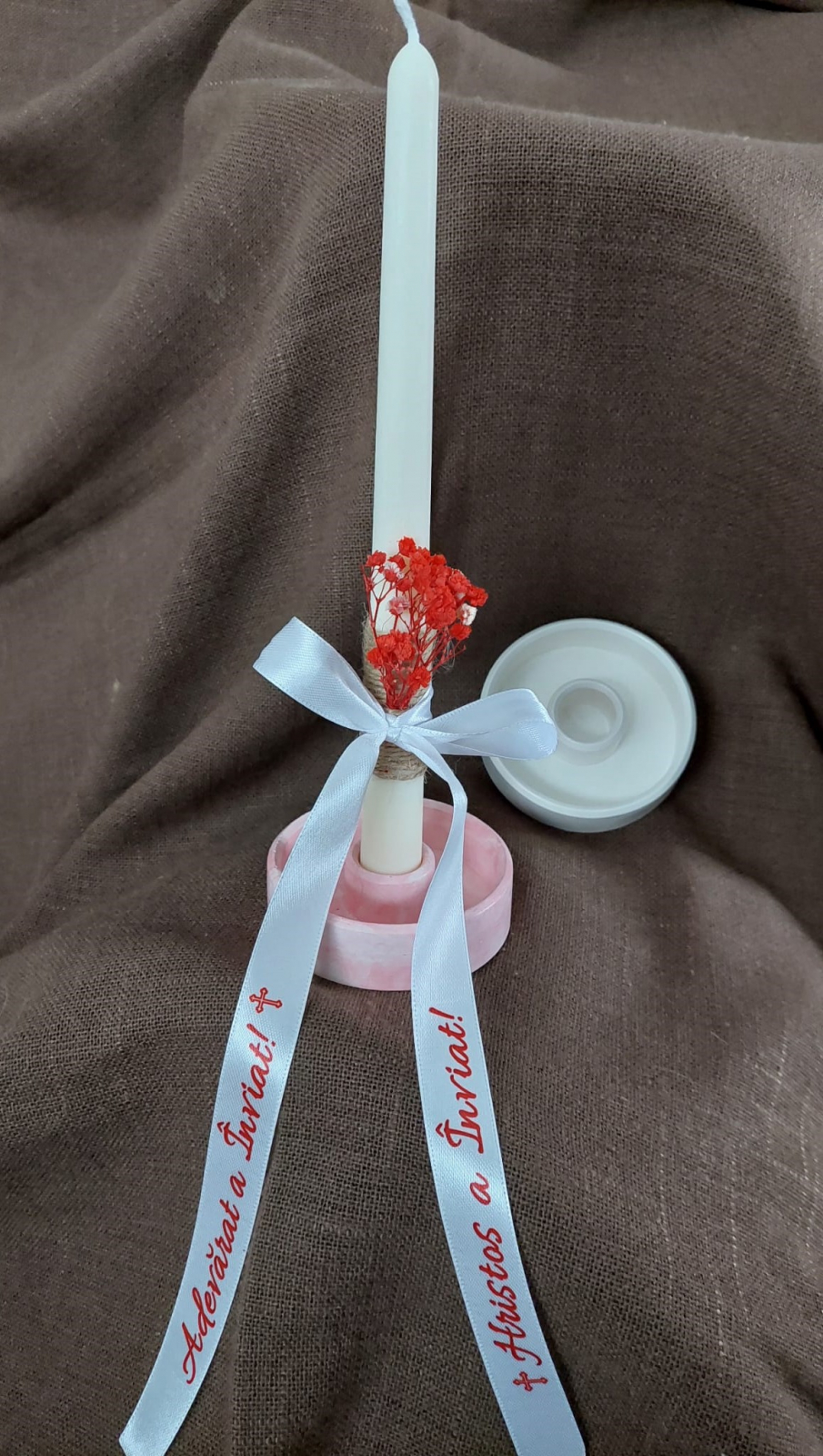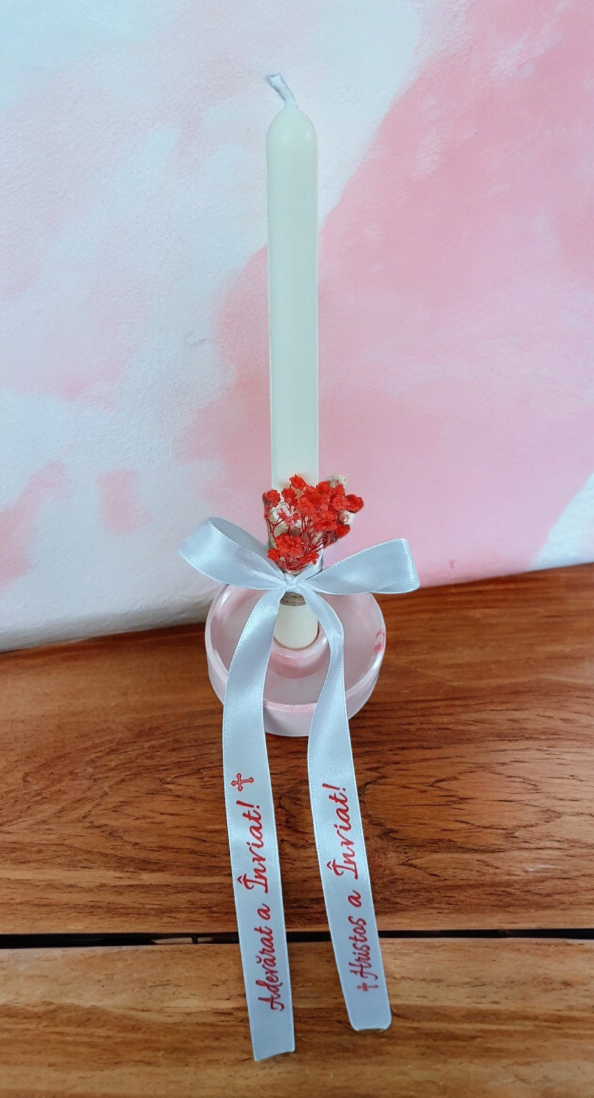 - lumânare parfumată conică tip stâlp, decorată cu flori criogenate ”Glixia” în culoare roșie și panglică din saten cu mesajul: ”Hristos a Înviat - Adevărat a Înviat”!